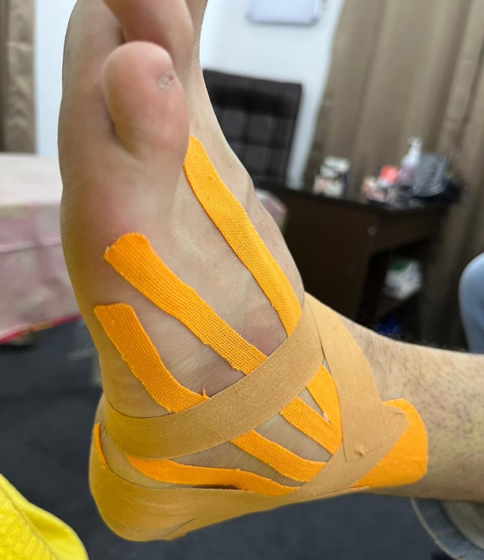 Application of therapeutic tape to support and stabilize muscles and joints, reduce pain, and enhance function.